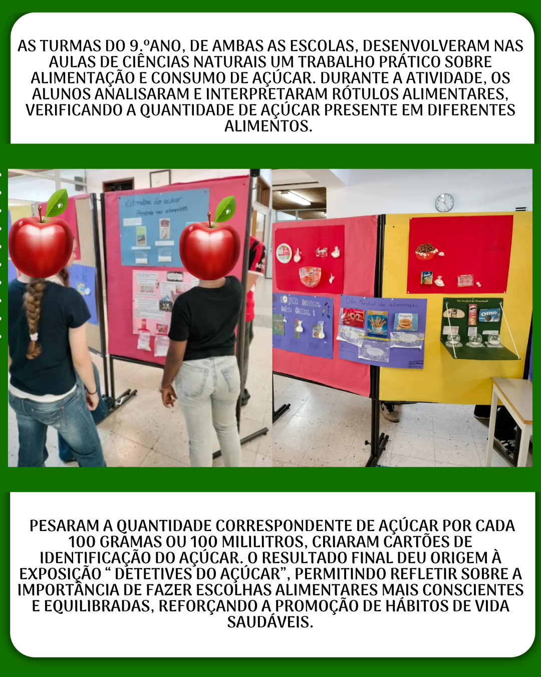 As turmas do 9.ºano, de ambas as escolas, desenvolveram nas aulas de Ciências Naturais um trabalho prático sobre alimentação e consumo de açúcar. Durante a atividade, os alunos analisaram e interpretaram rótulos alimentares, verificando a quantidade de açúcar presente em diferentes alimentos. Pesaram a quantidade correspondente de açúcar por cada 100 gramas ou 100 mililitros, criaram cartões de identificação do açúcar. O resultado final deu origem à exposição “ Detetives do açúcar”, permitindo refletir sobre a importância de fazer escolhas alimentares mais conscientes e equilibradas, reforçando a promoção de hábitos de vida saudáveis.